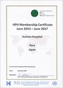 吉田病院は、2013年6月28日付で、日本で第12号のHPH(ヘルスプロモーション=健康増進活動拠点病院)加盟病院となりました。HPHは、健康増進を患者さま・地域・病院職員ですすめていくWHO(世界保健機構)が推奨する国際的な病院ネットワークです。